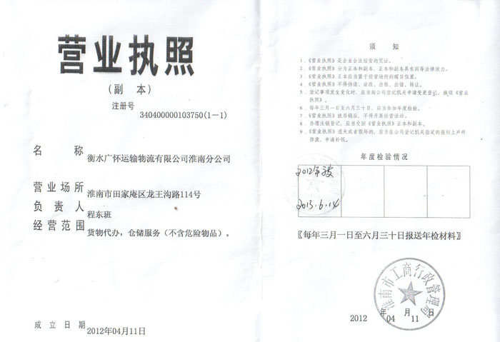 衡水广怀运输物流有限公司淮南分公司营业执照(副本)